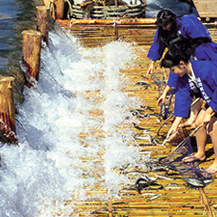 清流五ヶ瀬川の鮎は6月1日から12月初めまでが漁期で、ことに十月初めから川を簀(す)でせいて水郷名物「やな」が架設されます。