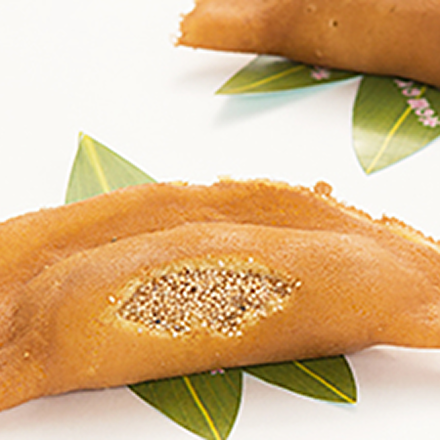 この鮎やな餅は、清流を泳ぐ鮎の姿をモチーフに、甘みのうすい手焼の薄皮で、ケシの実をまぶした求肥(ぎゅうひ)を包み、子持鮎に見たてた菓子であります。
